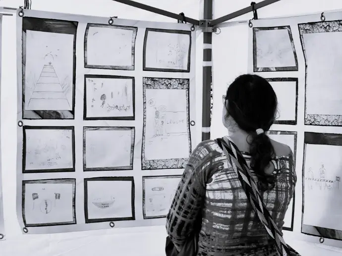 Pour que notre démarche ne se limite pas aux ateliers, nous avons créé trois expositions. Elles s'appuient sur les dessins et les réflexions de nos animations, invitant ainsi le public à s'interroger sur ses propres préjugés liés à l'immigration.